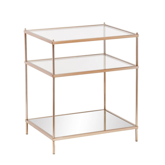27" Gold And Clear Glass And Iron End Table With Mirrored Shelf