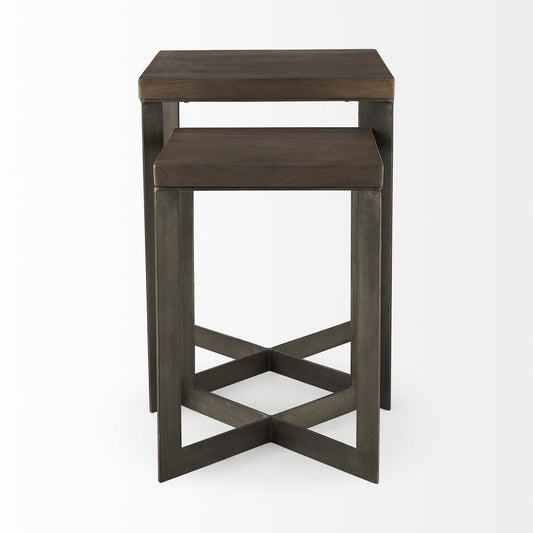 Set of Two Brown Solid Wood and Metal Square Cross Legs Nested Tables