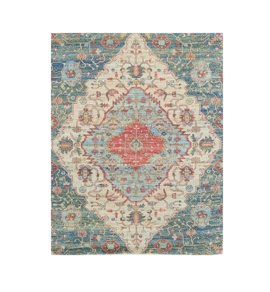 8' X 10' Blue Green And Red Wool Floral Hand Knotted Distressed Stain Resistant Area Rug With Fringe