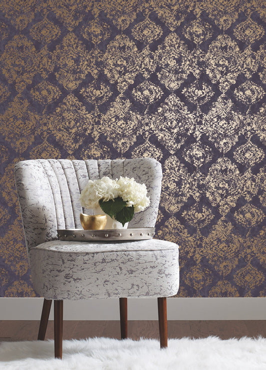 York Wallcoverings Antonina Vella Stargazer Plum and Gold Wallpaper Damasks Multicolor - NW3567