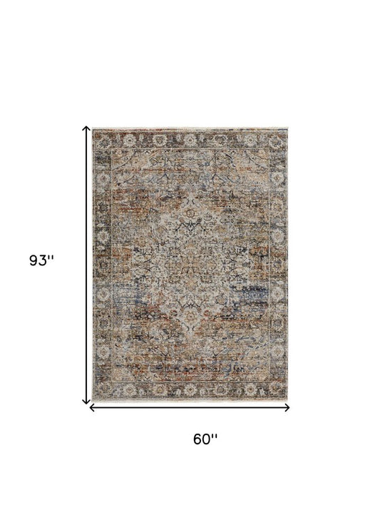 5' X 7' Beige And Grey Oriental Power Loom Non Skid Area Rug