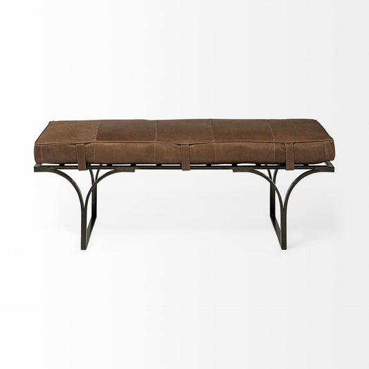 53" Brown and Black Upholstered Faux Leather Distressed Bench