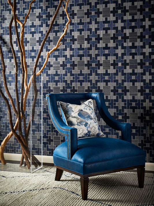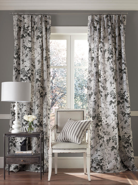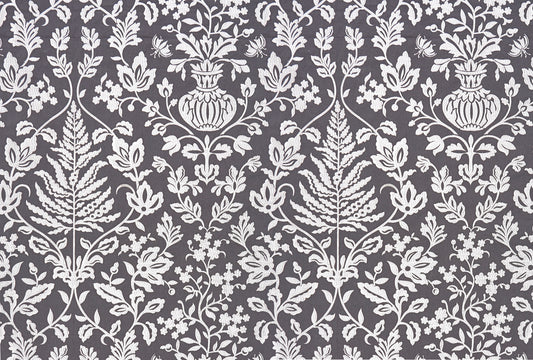 A bold floral traditional design in high‑contrast colorways (navy or black on white); created in the 1960s and remains a staple among Schumacher’s bestsellers