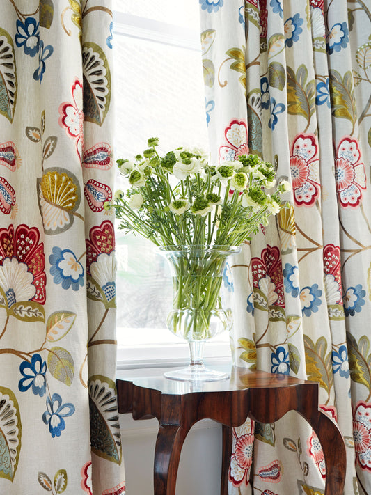 Nested within Schumacher's botanical print collection, this stylized hollyhock is frequently cited among top botanical fabrics and trending designs