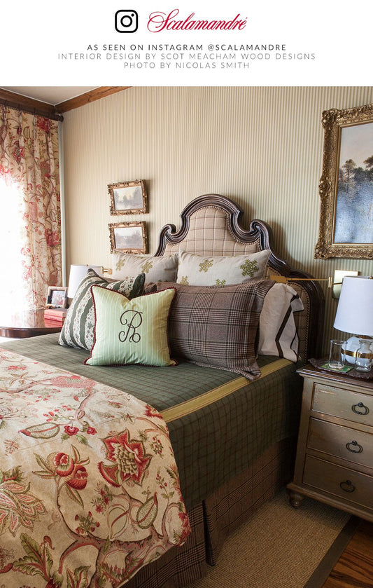 Nested within Schumacher's botanical print collection, this stylized hollyhock is frequently cited among top botanical fabrics and trending designs