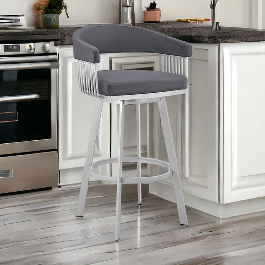 29" Gray And Silver Faux Leather And Iron Swivel Bar Height Bar Chair