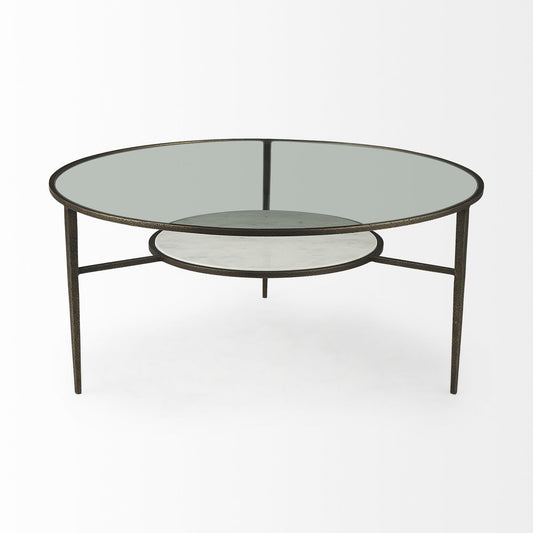 36" Antiqued Gold And White Glass Iron and Marble Round Pedestal Coffee Table