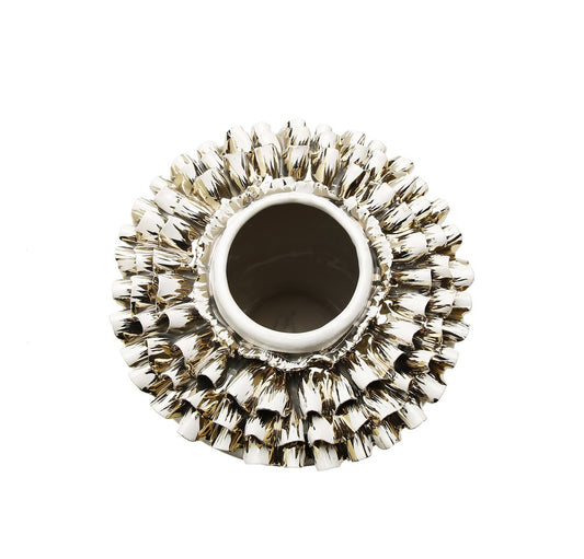 13" Gold And White Pierced Urn Porcelain Table Vase With Sculptural Details
