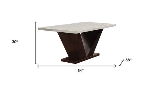 64" White And Dark Brown Marble And Solid Manufactured Wood Pedestal Base Dining Table