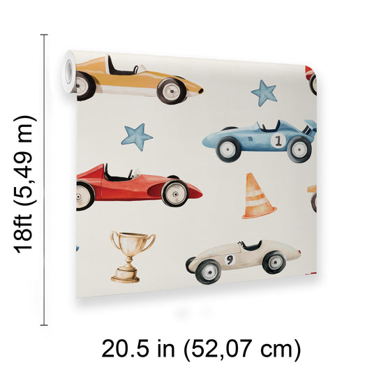 Veer Decor Vintage Race Cars Cream Ground Peel and Stick Wallpaper Children, Hobby Kids, Novelty Cream Wallpaper - 8335-AE1