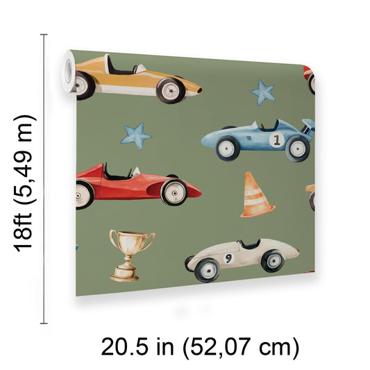 Veer Decor Vintage Race Cars Green Ground Peel and Stick Wallpaper Children, Hobby Kids, Novelty Green Wallpaper - 8335-AE2