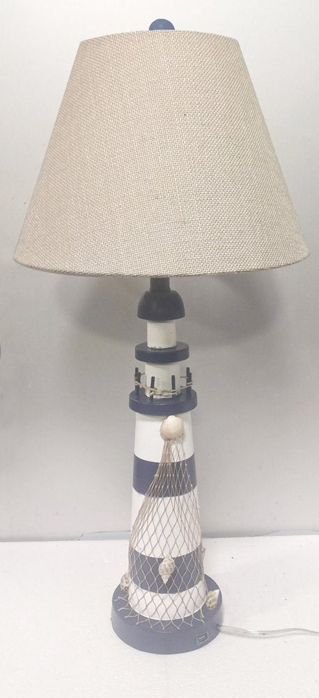 Set of Two 30" Blue And White Lighthouse USB Table Lamps With Cream Cone Shade