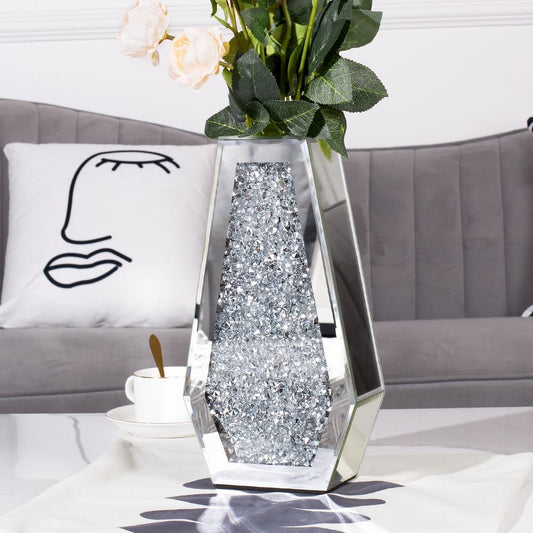 12" Silver Faux Crystal And Mirrored Glass Table Vase
