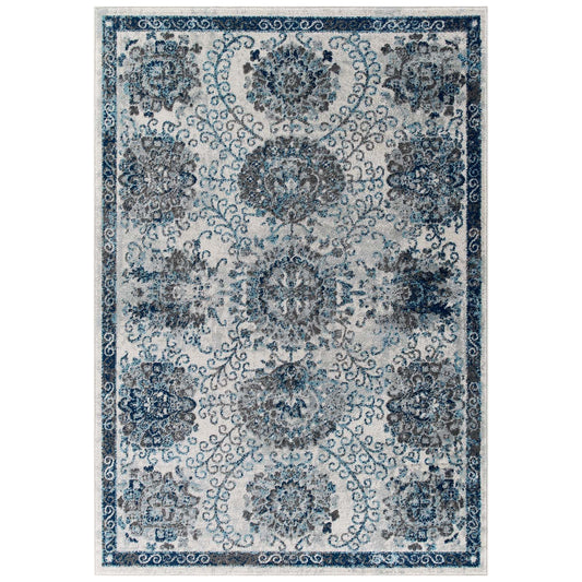Modway Outlet Entourage Malia Distressed Vintage Floral Vintage Medallion 5x8 Area Rug by Modway Living Room Rugs Ivory and Blue - R-1175B-58