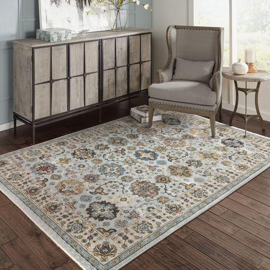 5' X 8' Blue Beige Grey Green Yellow And Rust Oriental Power Loom Stain Resistant Area Rug With Fringe