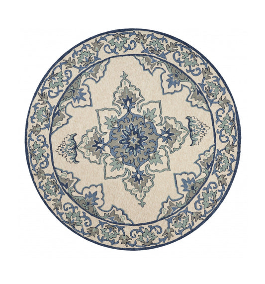 8' X 8' Ivory And Blue Round Indoor Outdoor Area Rug