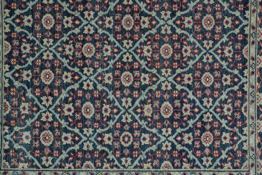 8' X 10' Blue Green And Red Wool Floral Hand Knotted Distressed Stain Resistant Area Rug With Fringe
