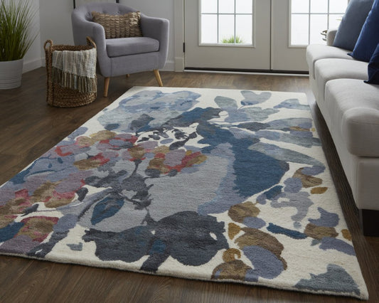 4' X 6' Ivory and Blue Wool Floral Hand Tufted Area Rug