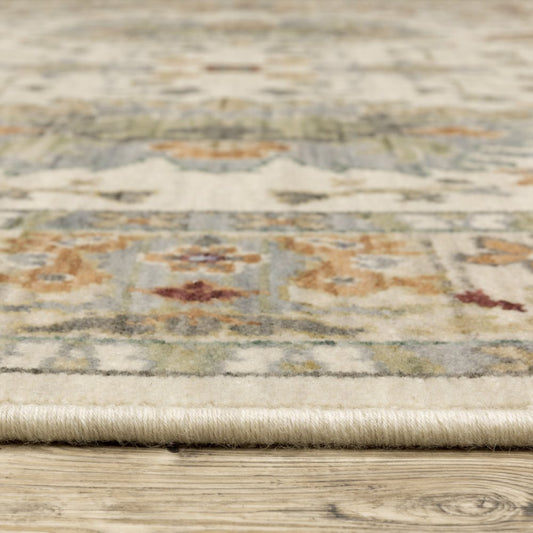 5' X 8' Ivory Red Green Grey Blue And Navy Oriental Power Loom Stain Resistant Area Rug With Fringe