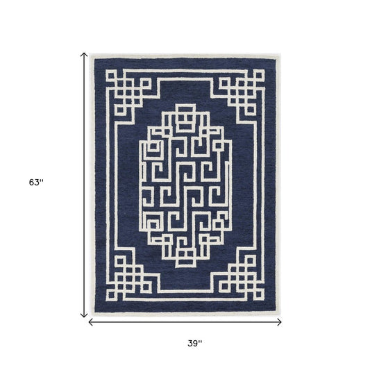 5' X 7' Navy Blue And Ivory Wool Geometric Hand Tufted Area Rug