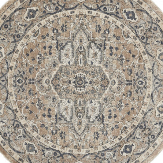4' X 4' Beige And Grey Round Abstract Power Loom Non Skid Area Rug