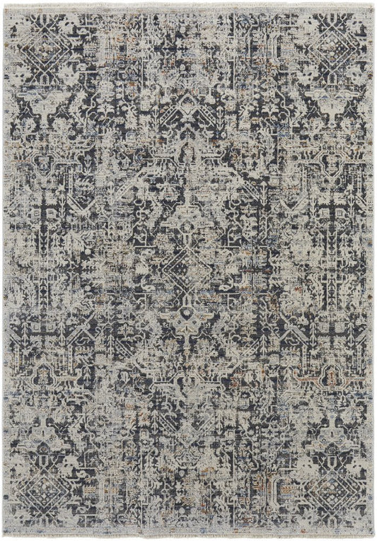 7' X 10' Gray And Ivory Oriental Distressed Area Rug With Fringe