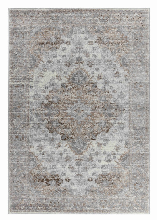 2' X 3' Grey Ivory Gold Salmon Red Blue And Green Oriental Power Loom Stain Resistant Area Rug With Fringe