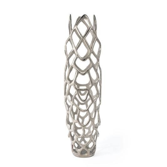 19" Silver Cast Aluminum Carved Geometric Table Vase