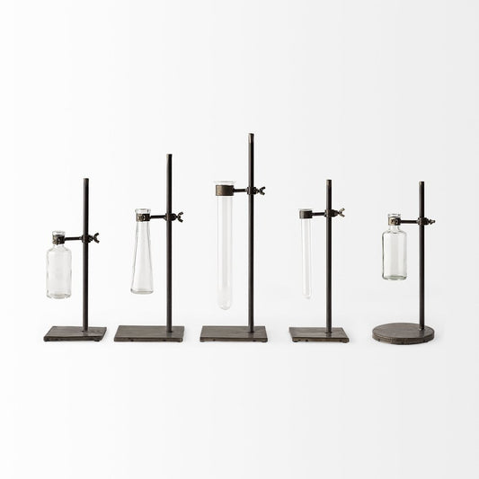 Set of Two Black Brown And Clear Cylinder Glass Metal And Wood Wall Vase