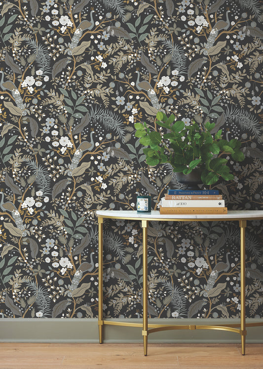 York Wallcoverings Peel and Stick Rifle Paper 3 Peacock Garden Black Peel and Stick Wallpaper Whimsical Animals and Insects Blacks Wallpaper - PSW1537RL