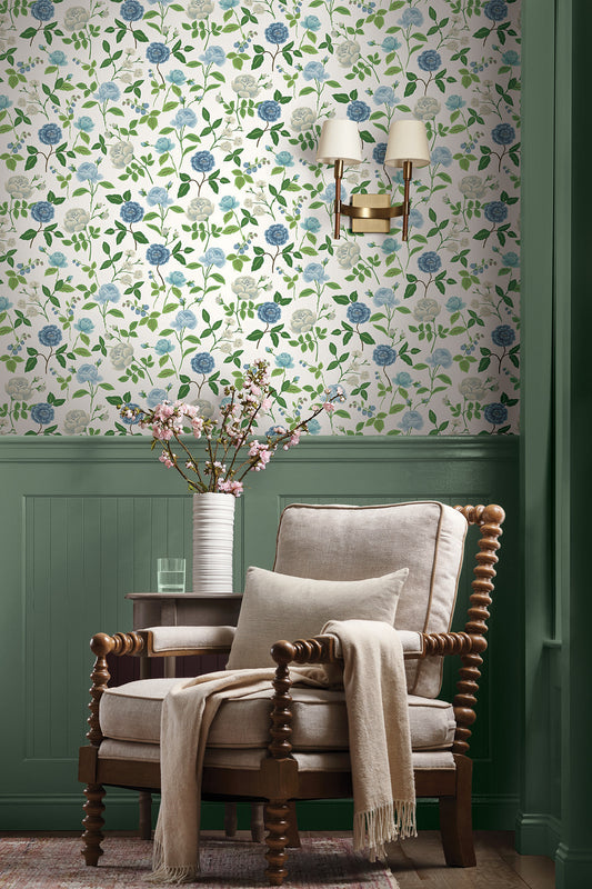 York Wallcoverings Rifle Paper Co. Hawthorne Blue and Green Wallpaper Botanical Blues - RI5132