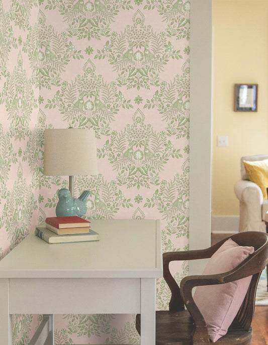 York Wallcoverings Erin and Ben Co. Cottontail Toile Pink and Chartreuse Peel and Stick Wallpaper Animals Pinks Wallpaper - PSW1432RL