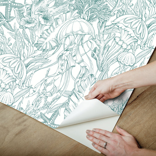 York Wallcoverings NuWallpaper Under the Sea Teal Peel and Stick Wallpaper Botanical Nautical Teal Current Peel & Stick - NUS6495