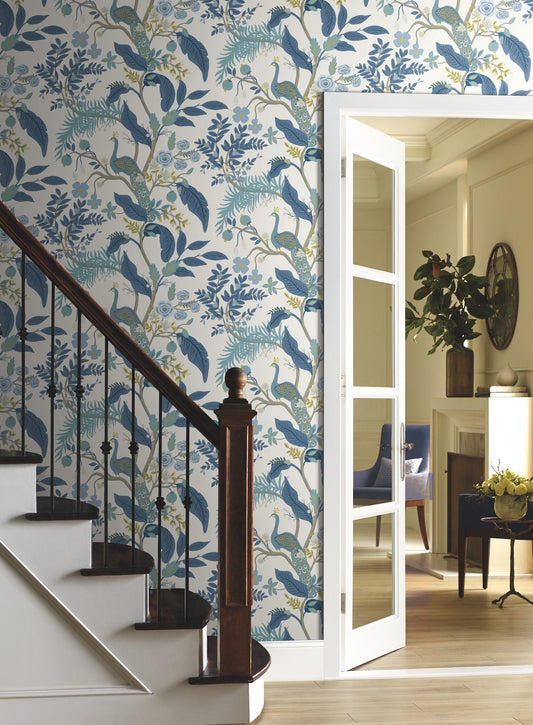 York Wallcoverings York Wallcoverings Rifle Paper Co. Peacock Blue & White Wallpaper Animals Animals Blue & White - RI5173