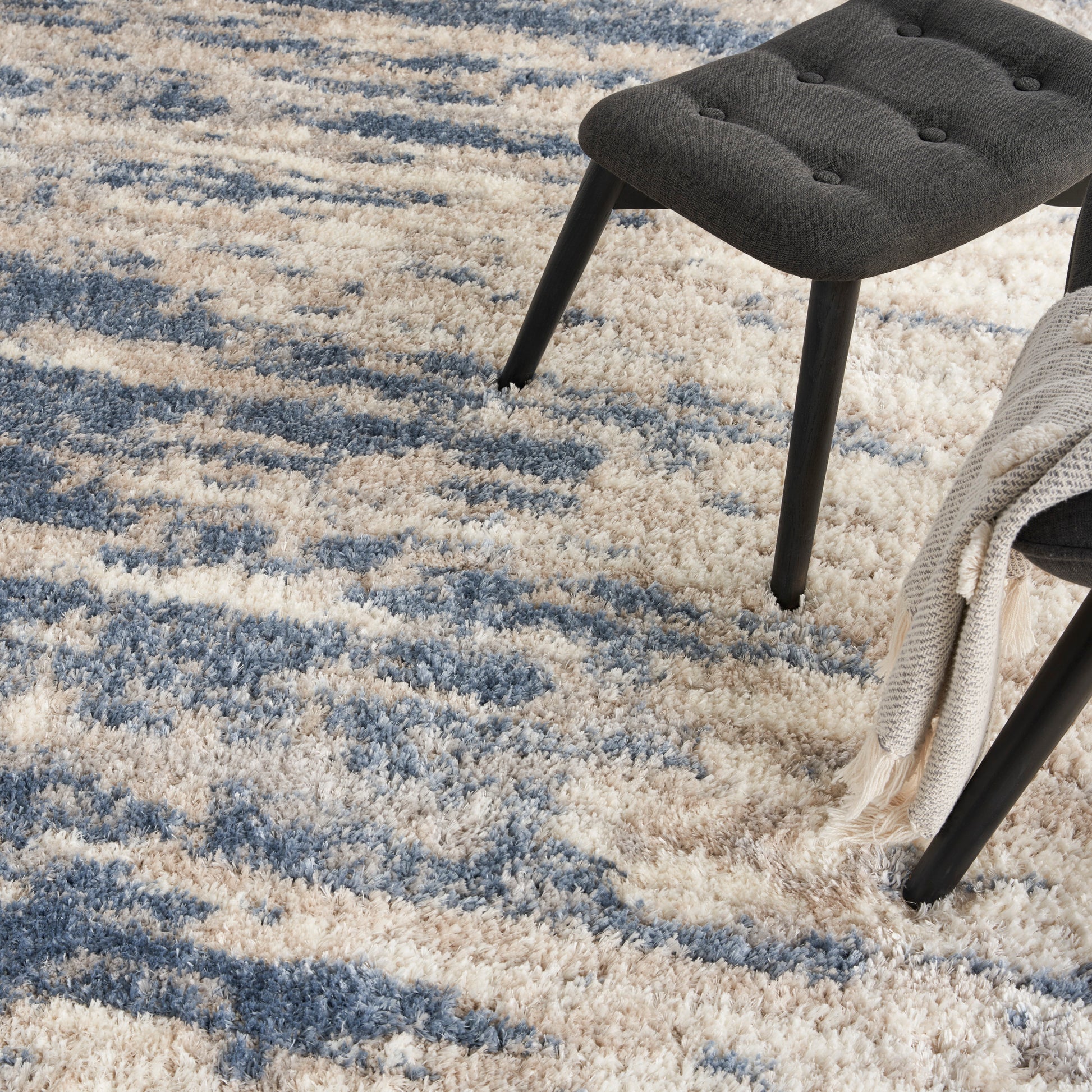 About Us: Hazy abstract designs, nature-inspired patterns and neutral hues come together to create the Dreamy Shag Collection. These modern rugs are crafted of irresistibly soft polyester fibers in an ultra-plush texture that you?ll love to sink your toes into. Make Dreamy Shag the centerpiece for your living room d?cor, or place in your bedroom for a cozy spot to plant your feet each morning. Invite a sense of calm to your home with the plush texture of this shag rug from the Dreamy Shag Collection. In neutral ivory and blue, it effortlessly complements a variety of modern and contemporary styles. Made from wonderfully soft polyester in a thick, 1.25? pile.