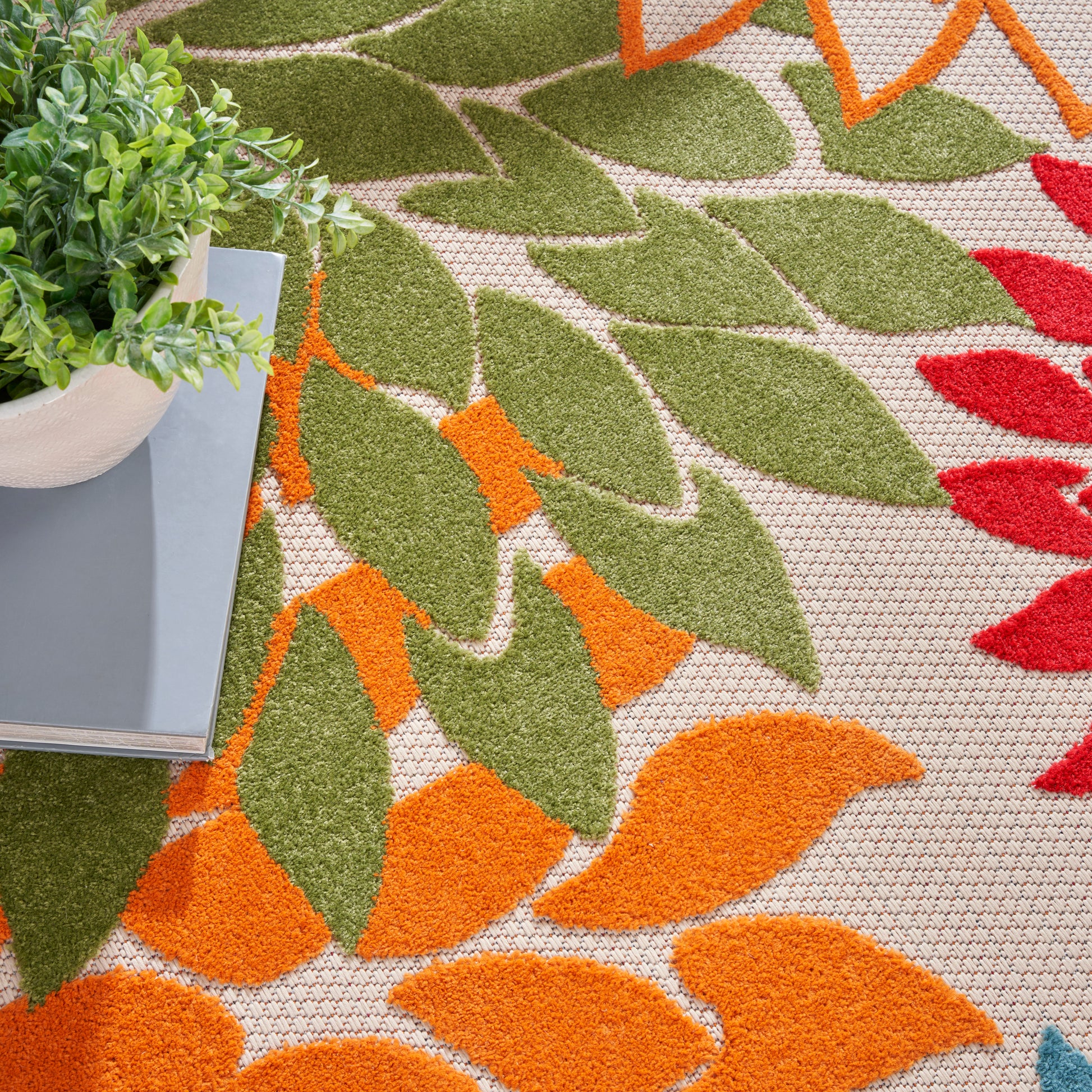About Us:For more than 30 years, Nourison has built a reputation as a leading multi-category resource in today?s floor covering market, working with designers and retailers to provide beautiful, top-quality rugs, carpets, and home accessories for homes around the world. Our company offers a comprehensive range of products across styles and price ranges, in both commercial and residential spaces. This sunny and sensational collection of flat-woven outdoor rugs is pretty, practical, and perfect for high-traffic areas. With its inviting assortment of classic and contemporary designs, tempting color palettes, and terrific textures, these multipurpose rugs will afford an air of simple sophistication to any environment. Bring extra life and excitement to your patio, deck, or porch with this Aloha floral outdoor rug. The high-low construction, presented in orange, red, and green add a festive touch of the tropics to your patio, deck, or porch. This rug is machine-made from premium stain-resistant fibers that are easily washable with a hose: simply rinse and allow both sides time to fully air dry. To extend the life of your rug, bring indoors during extreme weather.