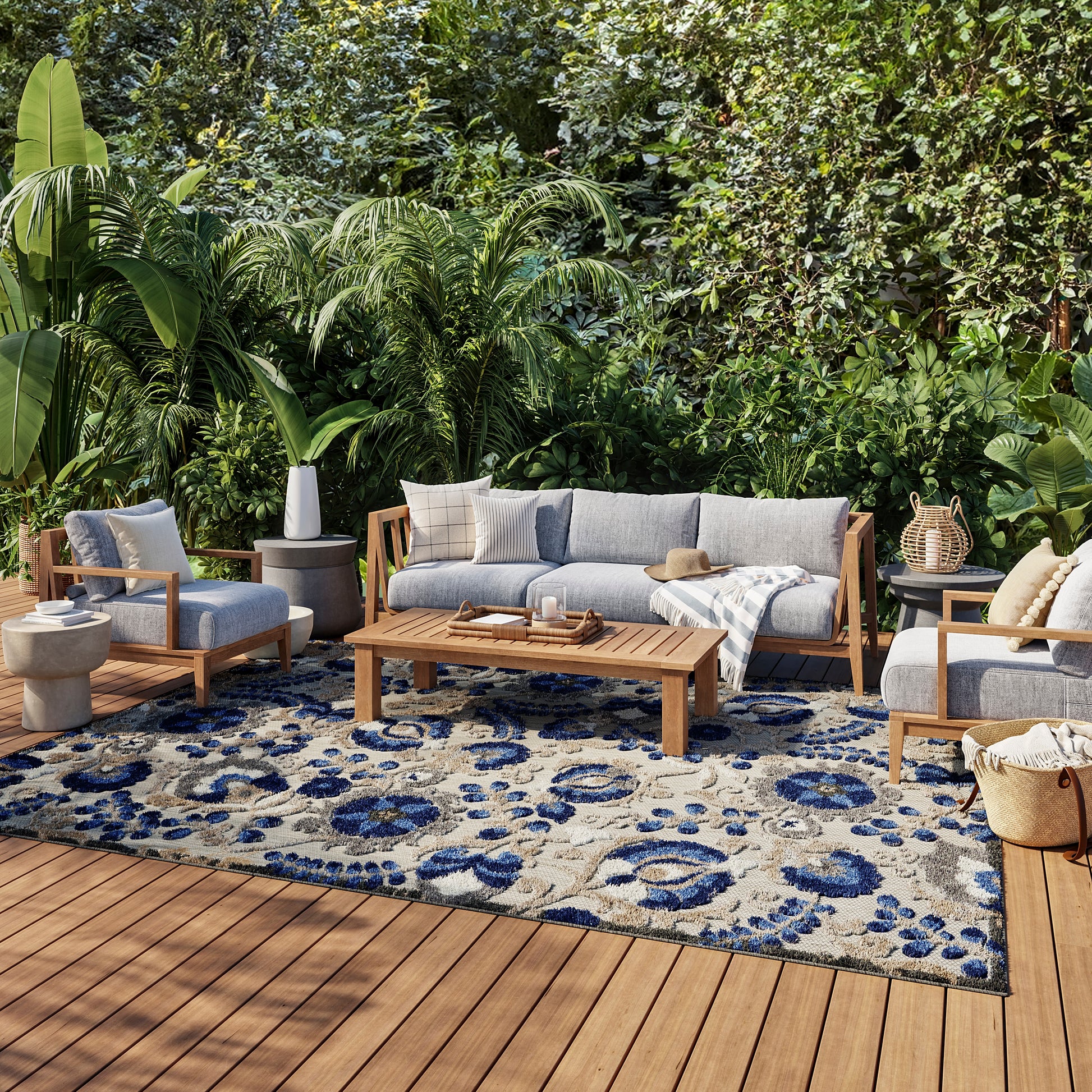 About Us: This sunny and sensational collection of flat woven outdoor rugs is pretty, practical and simply perfect for high traffic areas. With its inviting assortment of classic and contemporary designs, tempting color palettes and terrific textures, these multipurpose rugs will afford an air of simple sophistication to any environment.100% Polypropylene ? Flat Woven In swirling vines and flowers of blue, cream and grey, this Aloha outdoor rug complements your patio, porch or poolside setting. A high-low weave combines textural patterns with an intricately woven base for exceptional look that stands up to the elements. Machine-made from premium stain-resistant fibers that are easily washable with a hose: simply rinse and allow both sides time to fully air dry.