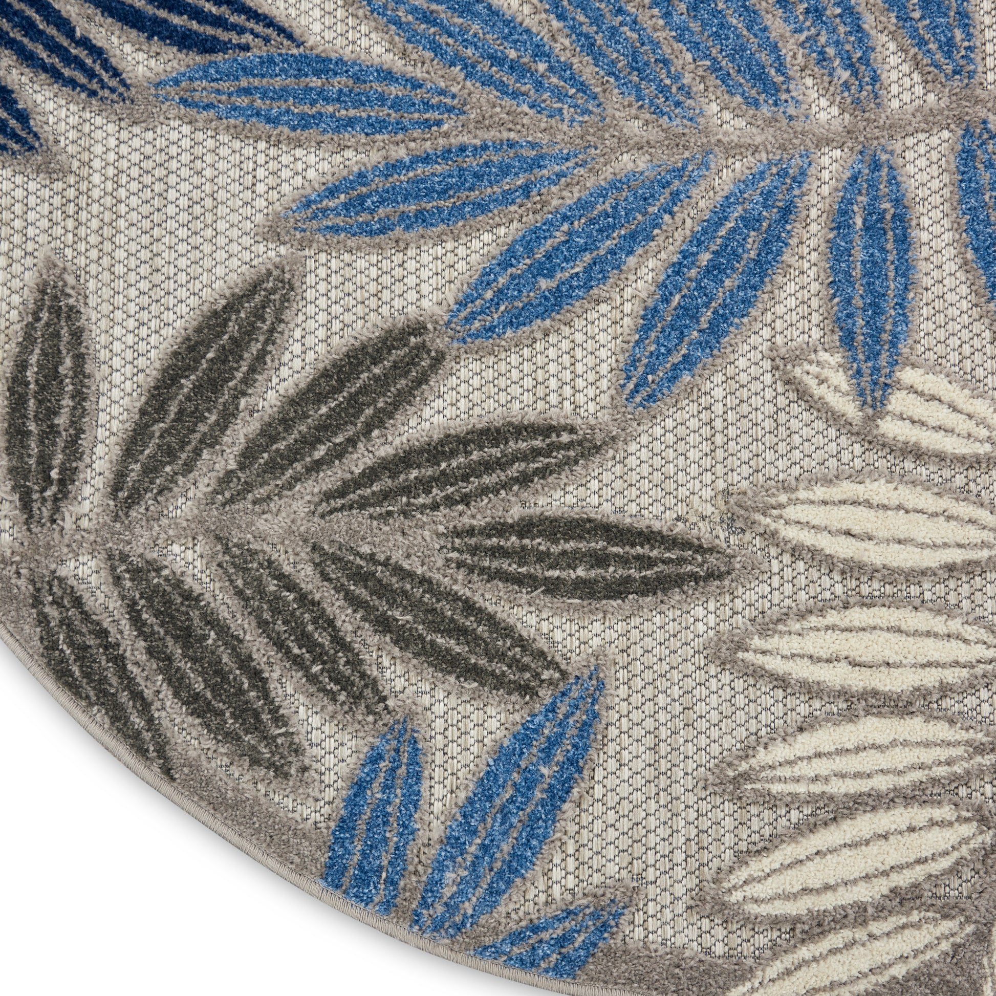 About Us: This sunny and sensational collection of flat woven outdoor rugs is pretty, practical and simply perfect for high traffic areas. With its inviting assortment of classic and contemporary designs, tempting color palettes and terrific textures, these multipurpose rugs will afford an air of simple sophistication to any environment.100% Polypropylene ? Flat Woven The cheerful and charming oversized leaf design of this Aloha outdoor rug is a fun way to bring tropical style to your patio, balcony, porch, deck, or yard. The high-low weave, presented in shades of blue, turquoise, cream and grey, adds soft texture and a pop of dimension designed to spark conversation. Machine-made from premium stain-resistant fibers that are easily washable with a hose: simply rinse and allow both sides time to fully air dry. To extend the life of your rug, bring indoors during extreme weather.
