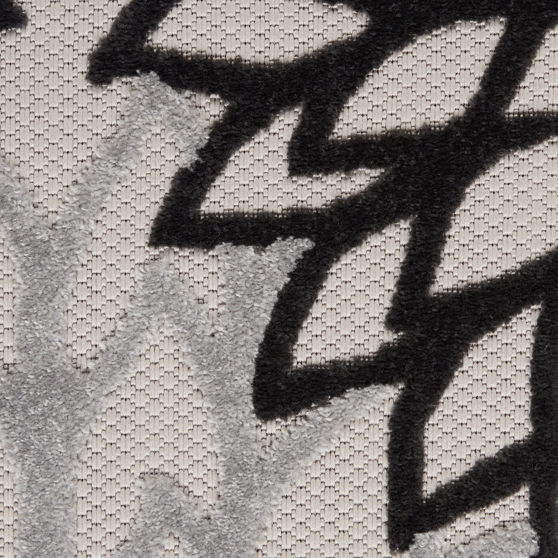 About Us: This sunny and sensational collection of flat-woven outdoor rugs is pretty, practical, and perfect for high-traffic areas. With its inviting assortment of classic and contemporary designs, tempting color palettes, and terrific textures, these multipurpose rugs will afford an air of simple sophistication to any environment. In shades of black, white and grey, this Aloha outdoor rug brings extra life and excitement to your patio, deck, or poolside. Its high-low construction combines delightful texture with an intricately woven base for an exceptional look and feel that stands up to the elements. This rug is machine-made from premium stain-resistant fibers that are easily washable with a hose: simply rinse and allow both sides time to fully air dry. To extend the life of your rug, bring indoors during extreme weather.