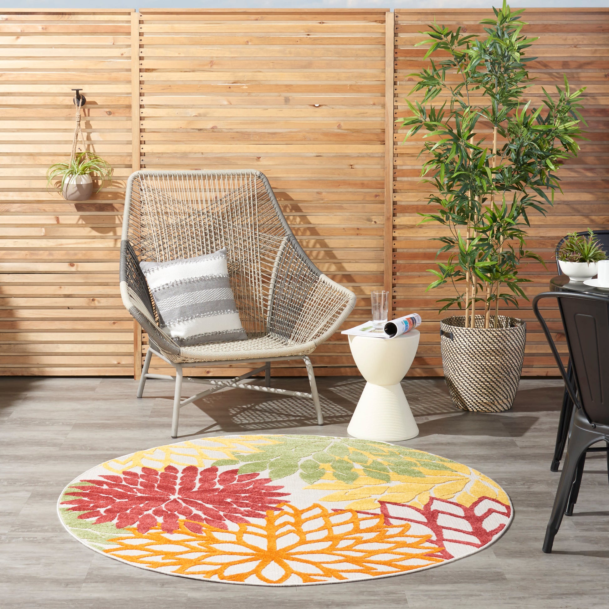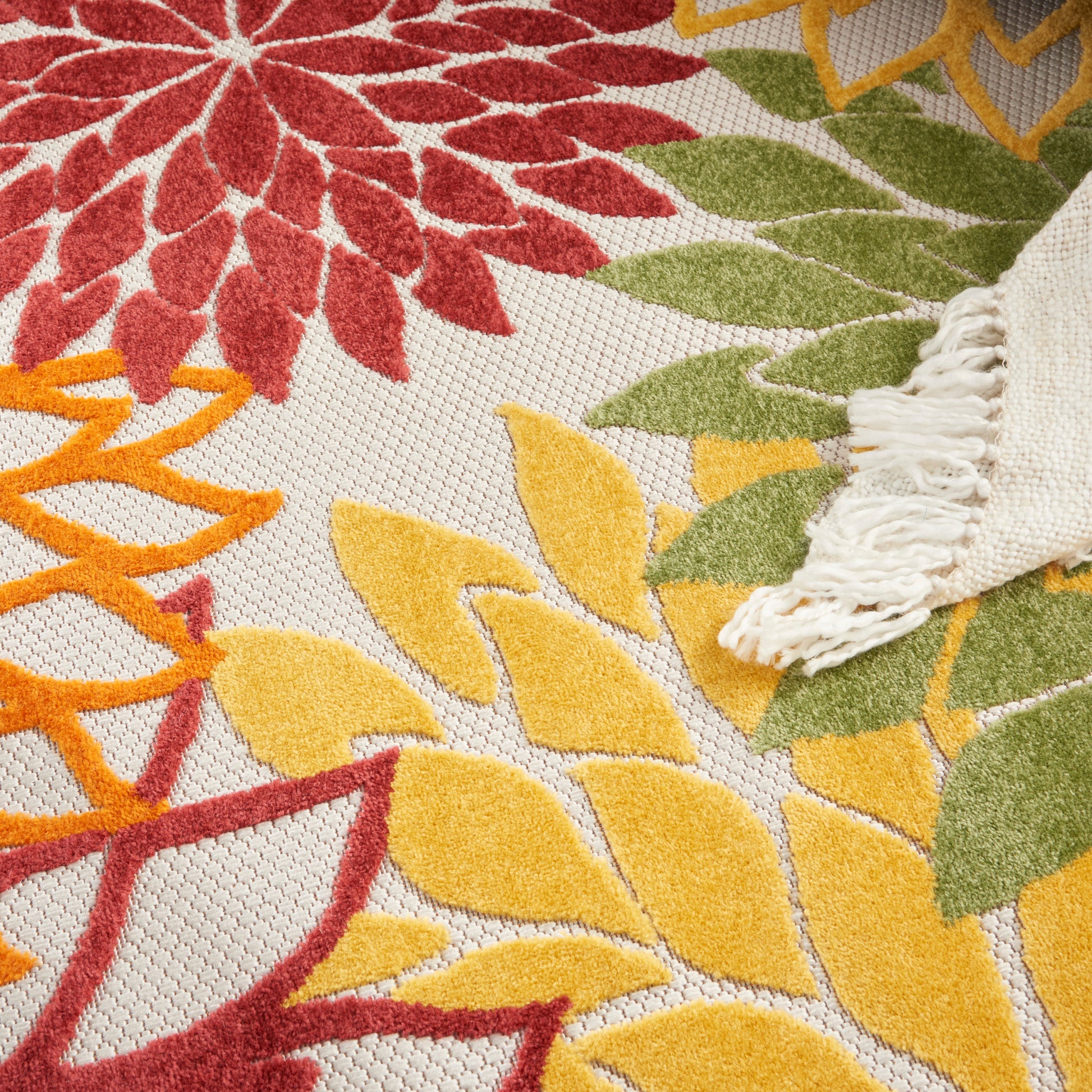 About Us: This sunny and sensational collection of flat-woven outdoor rugs is pretty, practical, and perfect for high-traffic areas. With its inviting assortment of classic and contemporary designs, tempting color palettes, and terrific textures, these multipurpose rugs will afford an air of simple sophistication to any environment. Bring extra life and excitement to your patio, deck, or porch with this Aloha floral outdoor rug. The high-low construction, presented in red, yellow, green, and orange add a festive touch of the tropics to your patio, deck, or porch. This rug is machine-made from premium stain-resistant fibers that are easily washable with a hose: simply rinse and allow both sides time to fully air dry. To extend the life of your rug, bring indoors during extreme weather.