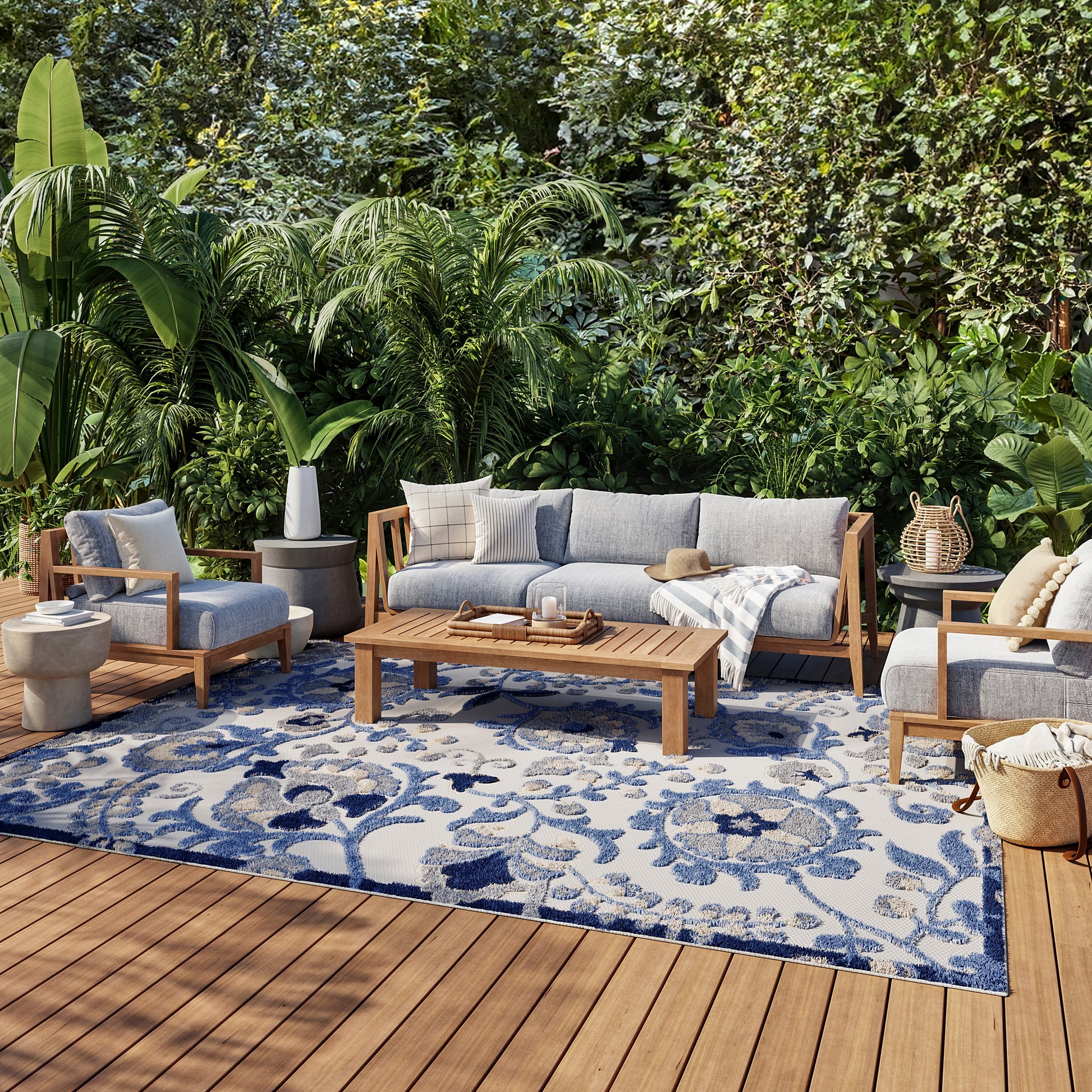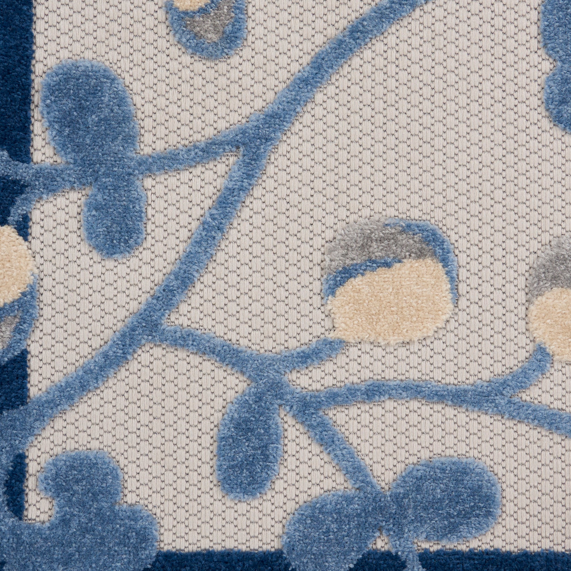 About Us: This sunny and sensational collection of flat-woven outdoor rugs is pretty, practical, and perfect for high-traffic areas. With its inviting assortment of classic and contemporary designs, tempting color palettes, and terrific textures, these multipurpose rugs will afford an air of simple sophistication to any environment. In swirling vines and flowers of blue, cream and grey, this Aloha outdoor rug complements your patio, porch or poolside setting. A high-low weave combines textural patterns with an intricately woven base for exceptional look that stands up to the elements. Machine-made from premium stain-resistant fibers that are easily washable with a hose: simply rinse and allow both sides time to fully air dry. To extend the life of your rug, bring indoors during extreme weather.
