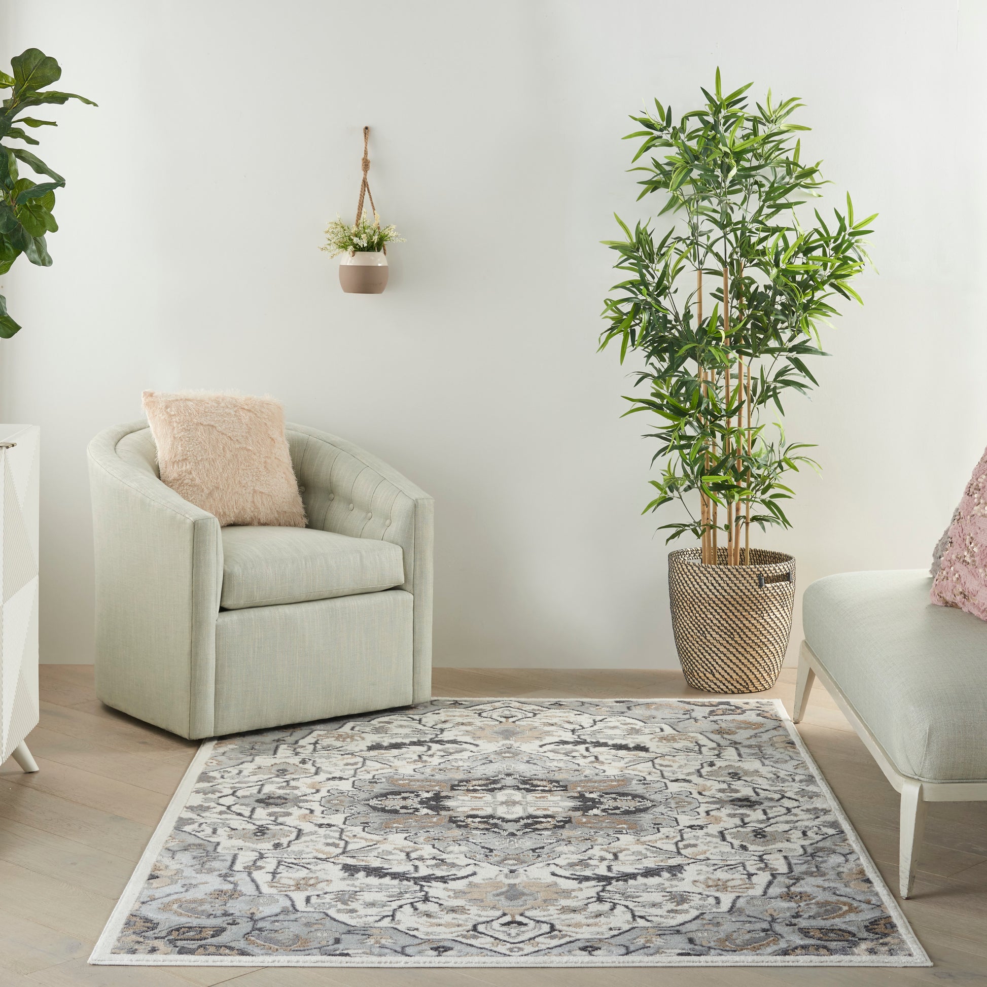 About Us: From vintage floral patterns to crisp geometric and abstract designs, the Elation Collection of area rugs creates a chic foundation for your d?cor. Choose from a range of rug sizes to complement your entryway, living room, or bedroom with fresh style. Expertly crafted of low-profile polypropylene and polyester fibers for lasting comfort, easy cleaning, and soft texture. Create a welcoming environment in your living room, bedroom, dining room, or home office with this Elation Collection area rug. A Persian-inspired floral medallion in cool grey and ivory hues add a soft and elegant vibe to boho chic, farmhouse, and contemporary decor. This vintage-inspired design is machine made of polypropylene and polyester for soft texture, easy cleaning, and lasting comfort.