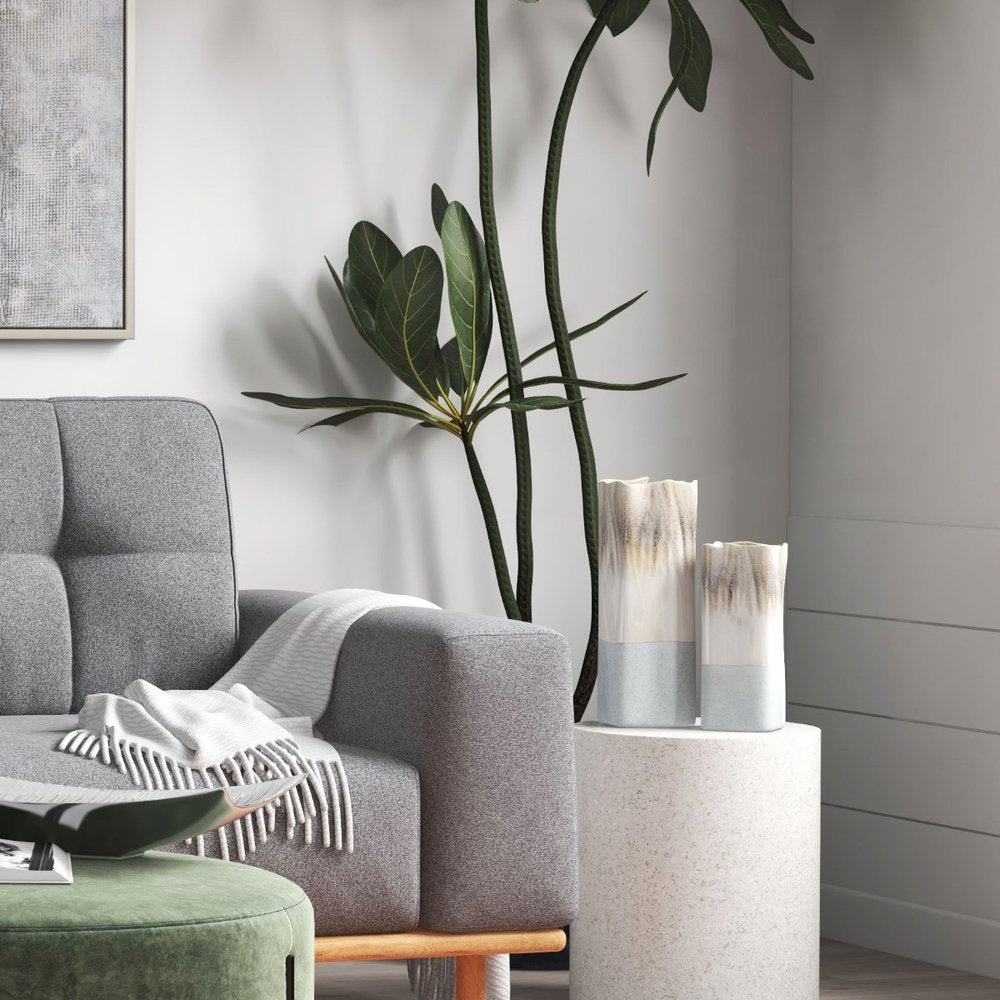 16" Brown Light Blue And Off White Color Block Square Ceramic Table Vase