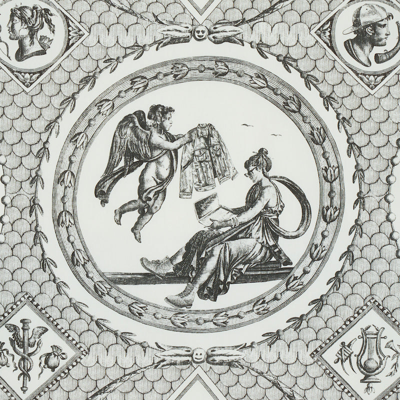 Use:For a tongue-in-cheek take on antiquity, our in-house artists modernized an 18th-century Jean-Baptiste Hu??t pattern by seamlessly embedding playful contemporary references??everything from combat boots to to-go coffee cups??into Greco-Roman mythological vig