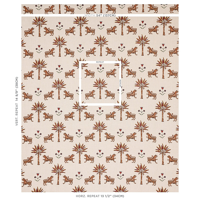 Use:Part of the Mystique collection, Tiger Palm in crimson is an open, organized pattern printed on a soft linen ground. Inspired by antique block prints, this versatile, mid-scale fabric design features stylized palm trees, rampant tigers, and Ottoman flowers. Also available as a wallcovering.