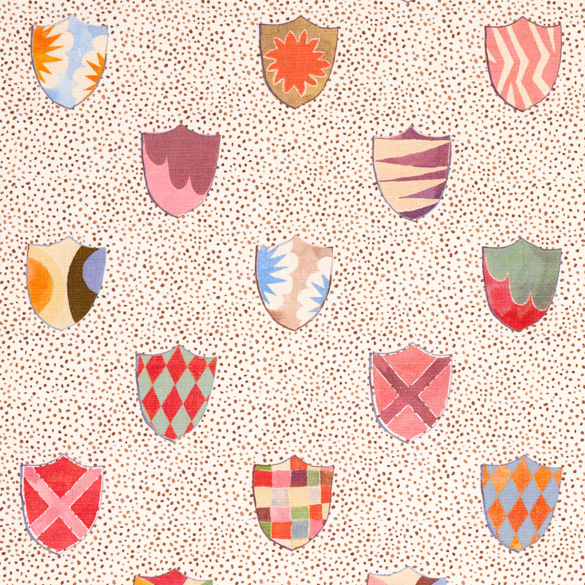 Use:A delightful small-scale print by Happy Menocal, Heraldic in sprezzatura breathes new life and levity into an ancient aristocratic motif. Colorful shields featuring whimsical patterns are rendered with a painterly hand against a mottled background. Also available as a wallpaper.