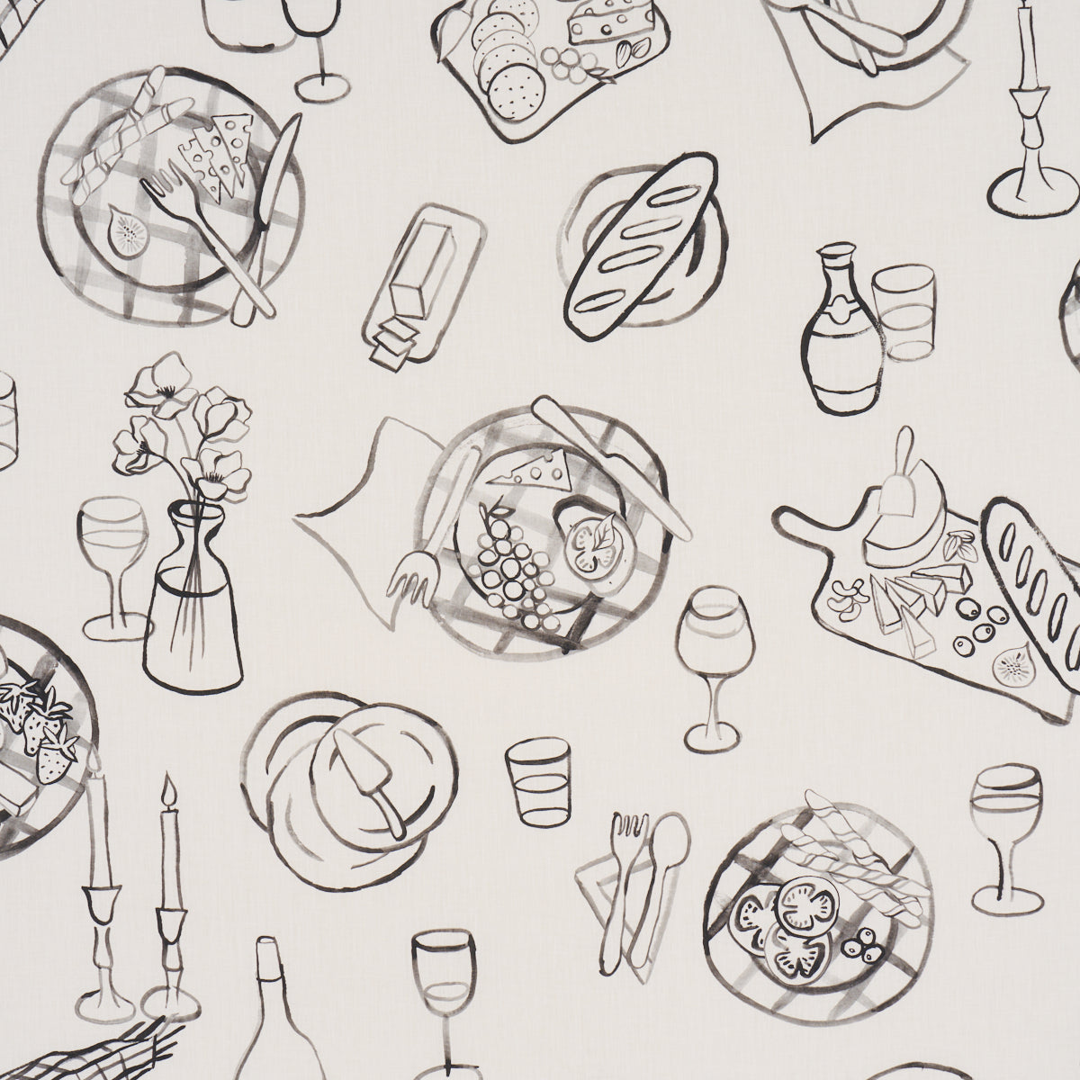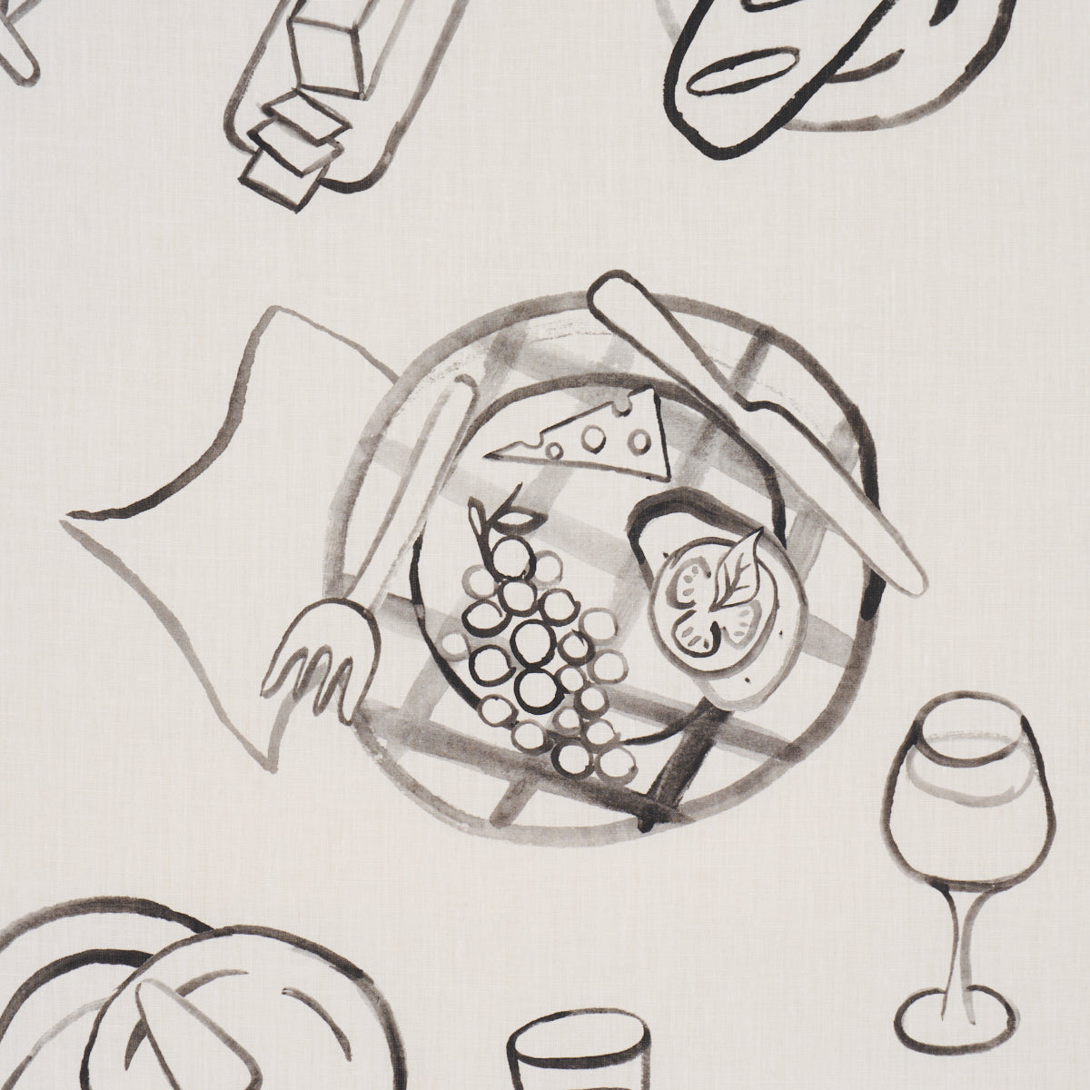 Use:Every delectable element of a plein air feast is rendered with a loose, gestural hand in this unique large-scale fabric that brings a Parisian picnic to life. Based on original artwork created in our studio and printed on cotton-linen union cloth, Pique-Nique has a wonderful hand-painted aesthetic that is relaxed and playful, yet sophisticated and chic.