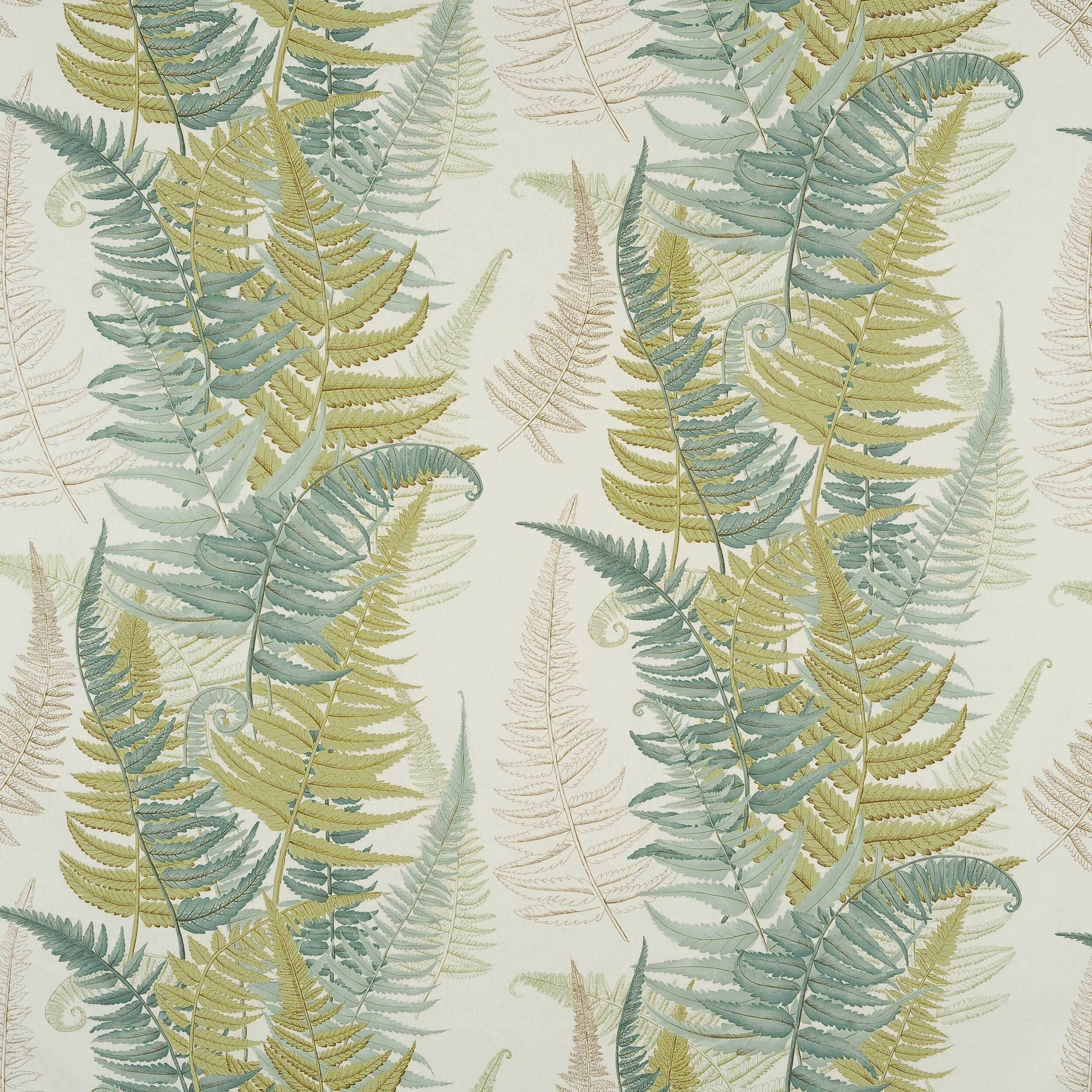 Cotton pillow in Cowtan & Tout Belle Grove – Aqua, featuring lush tropical fern leaves in layered tones of blue, green, and gold on a soft ivory ground — a perfect blend of artistry, texture, and refinement.