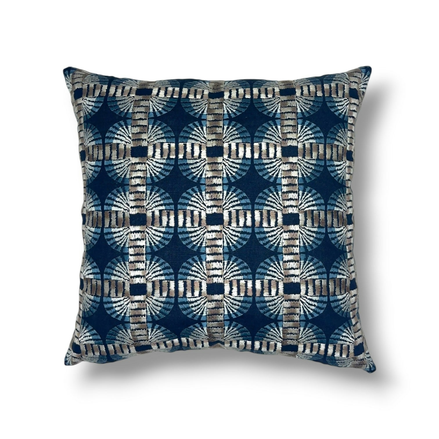 20" Indigo / Blue / Navy / Taupe Cotton Blend (AppliquéEmbroidered Linen Blend Pillow Cover in Clarence House Jimbaran – Indigo Fabric