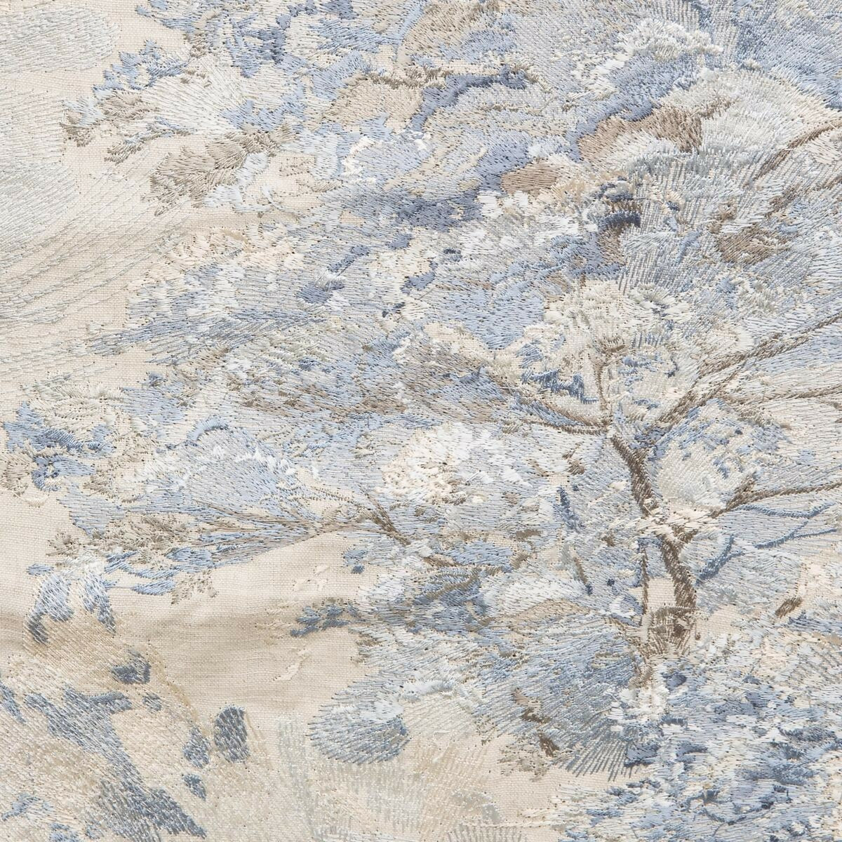 Elegant embroidered pillow in Holly Hunt’s Lake Como: Serenity. This exquisite linen-blend textile features a painterly scenic landscape in soft shades of blue, taupe, and ivory. The intricate stitching and luxurious texture bring an artful sophistication to any space, perfect for transitional and contemporary interiors.